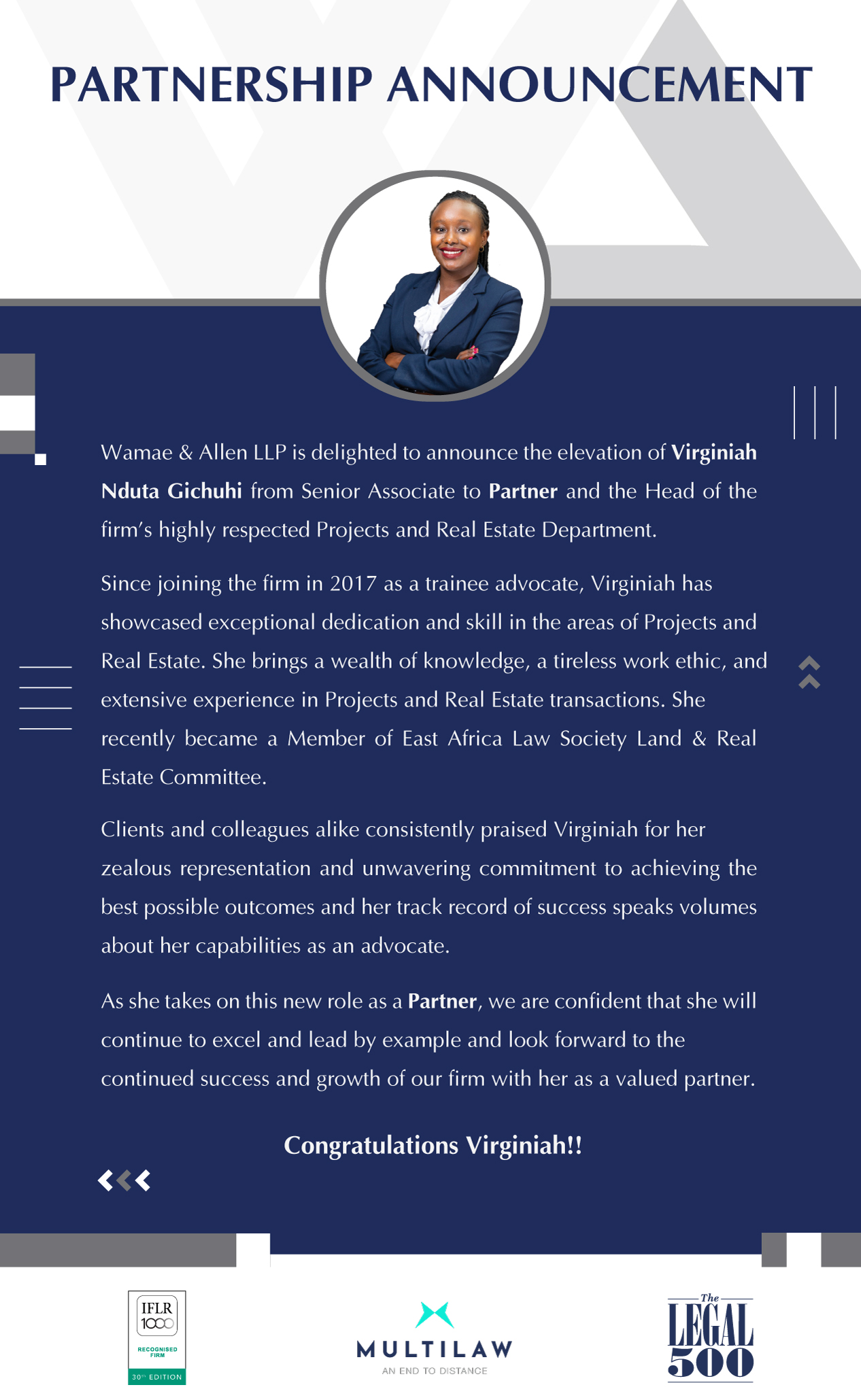Wamae & Allen LLP is delighted to announce the elevation of Virginiah Nduta Gichuhi from Senior Associate to Partner and the Head of the the firm’s highly respected Projects and Real Estate Department.